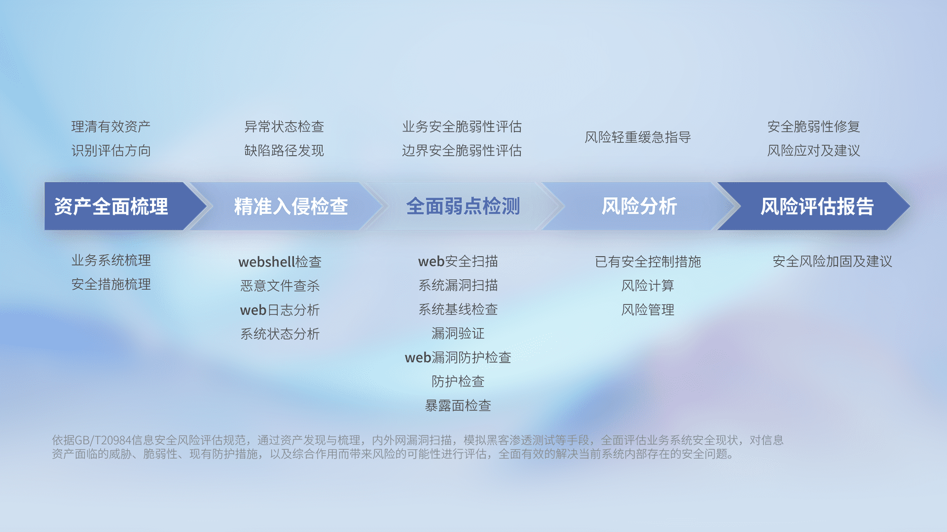 针对客户行业特性,,,,以专业的安全服务+多厂商联合解决方案提供专属的一站式安全管理服务,,帮助客户全面感知网络空间威胁,,基于识别、、、检测、、、、分析、、、、防护、、、监测、、、响应的服务理论模型,,,,从方案咨询、、、集成交付、、、、评估验证、、、优化加固、、运维运营,,,,致力于为客户提供完整的闭环管理式安全服务。。。。以实战经验为客户打造高抵御风险的安全体系,,,帮助客户发现威胁、、、、对抗威胁、、、、处置威胁,,,,不断积累安全对抗能力,,,,持续保障数字化安全。。。